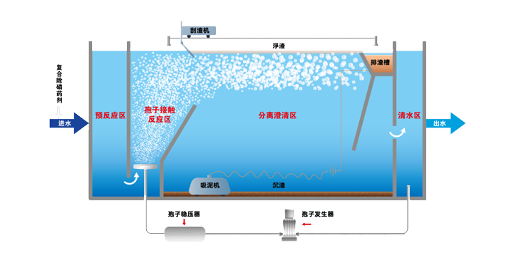 孢子轉(zhuǎn)移技術(shù),是將混凝技術(shù)、氣浮技術(shù)與微納米孢子相結(jié)合,通過(guò)定制化藥劑、微納米氣泡與水中的磷、疏水基懸浮物發(fā)生反應(yīng),創(chuàng)新形成的一種高效物理化學(xué)處理方法。主要解決了目前常用溶氣氣浮技術(shù)在應(yīng)用過(guò)程中存在的處理效率較差、表面負(fù)荷較低、處理能耗較高、應(yīng)急機(jī)動(dòng)性不強(qiáng)等問(wèn)題。